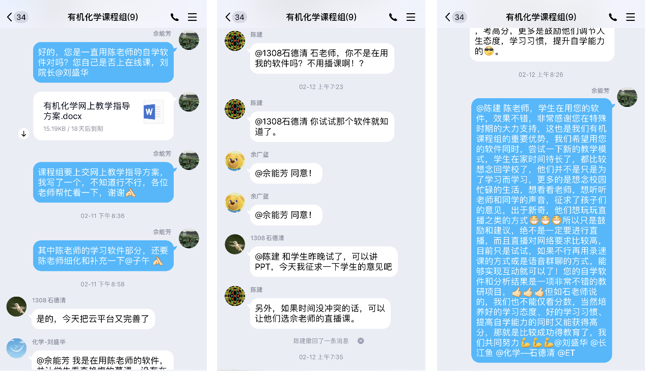 为保证我院《有机化学》课程组网上教学工作顺利进行,《有机化学》授课教师佘能芳在网上开学前积极联系课程组老师传达网络教学具体安排,并结合课程教学的实际情况,制定出台《有机化学网上教学指导方案》等文件。课程组老师们多次利用QQ群在线上进行备课研讨、交流教学心得等,共同贯彻“以学生的发展为中心”的教学理念。