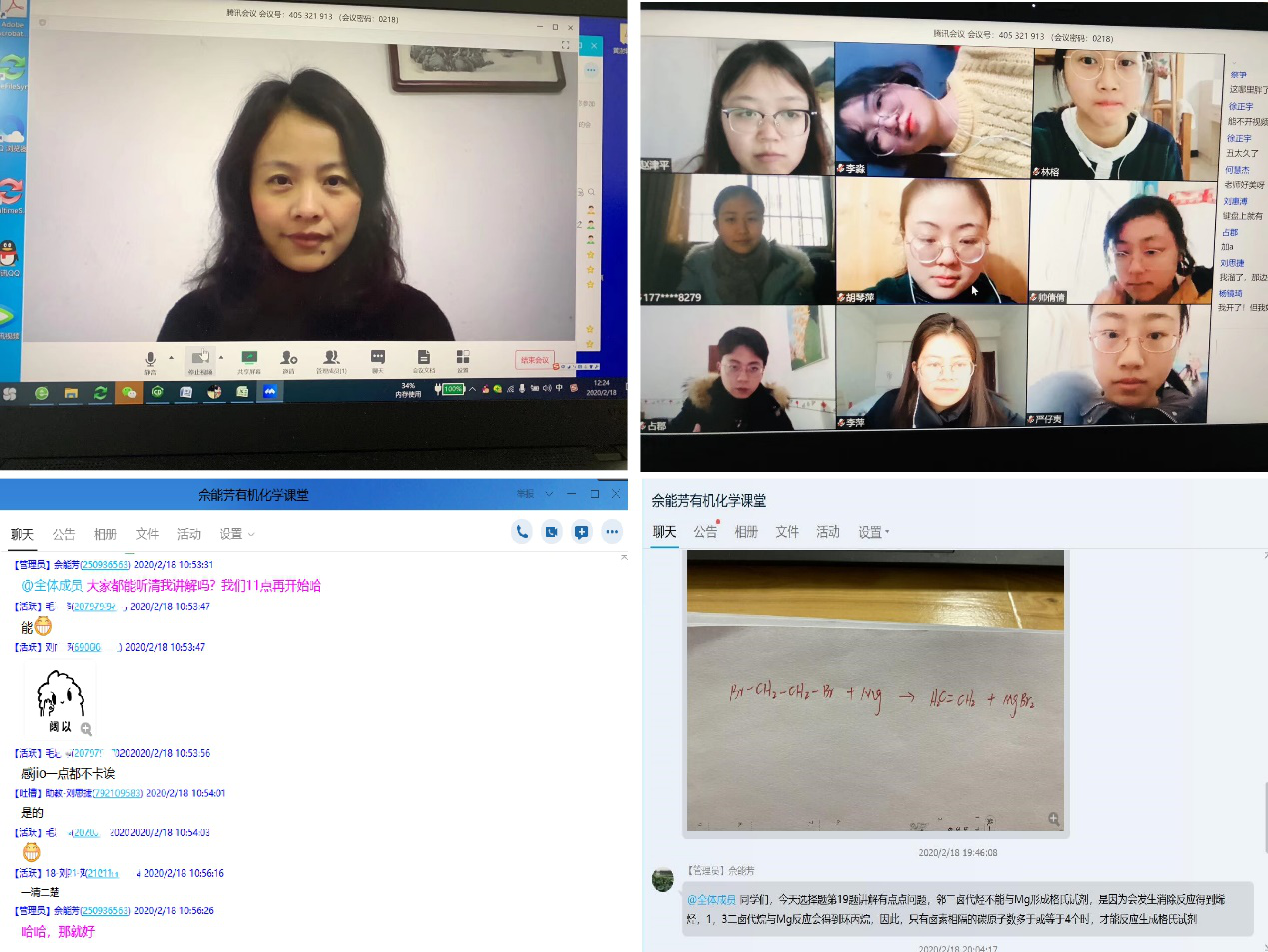 特殊时期,网络教学既要保证基本的课程教学质量,同时要将课堂与思政相结合,发挥专业课程价值引领作用。《有机化学》授课教师佘能芳在授课过程中结合疫情防控现状,积极向同学们传递社会正能量。同时,佘老师为了确保线上教学正常运行,并努力保持教学进度、保证课程容量和质量,做到标准不降、内容不减、效果不差,积极采取网络教学创新方案。学生在课前课后利用“云课堂平台+QQ群及微信群+有机化学学习软件”进行“预习+练习+答疑”。在正式授课前,为防止网络阻塞,佘老师做了三手准备,对多种授课平台提前进行测试检查通达性,最终确定“腾讯会议”平台,通过“视频语音直播+PPT共享+手写板书”等技术授课。授课过程中,佘老师重视教学反馈,在讲解过程中不断进行互动,保证同学们的听课质量,效果良好。