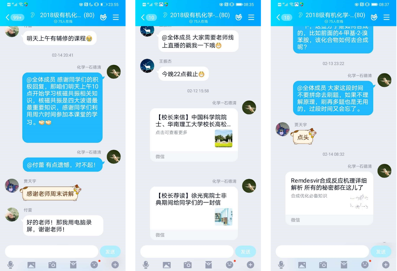 《有机化学》课程教师石德清坚持“一切以学生为中心”、努力打造好“让学生满意”的《有机化学》课堂。石老师在上学期结束时便上传了本学期的部分课间供同学们假期预习,同时在本学期开学之前将剩余课件及学习内容上传至云平台,充分发挥学生自主性。应同学们要求,石老师课堂率先采用“腾讯会议”软件,开展网络直播课程的教学工作,深受学生好评。为保证学习的连贯性,石老师利用周末主动增加一堂长达两小时的波谱课程,吸引了不少其他班级同学旁听。此外,为激发同学们学习《有机化学》的兴趣,石老师为同学们分享了疫情期间广受关注的新药“瑞德西韦”的合成路线和反应机理。同时,老师及时向同学们传送学校的通知安排,坚定同学们战胜疫情的必胜信心。