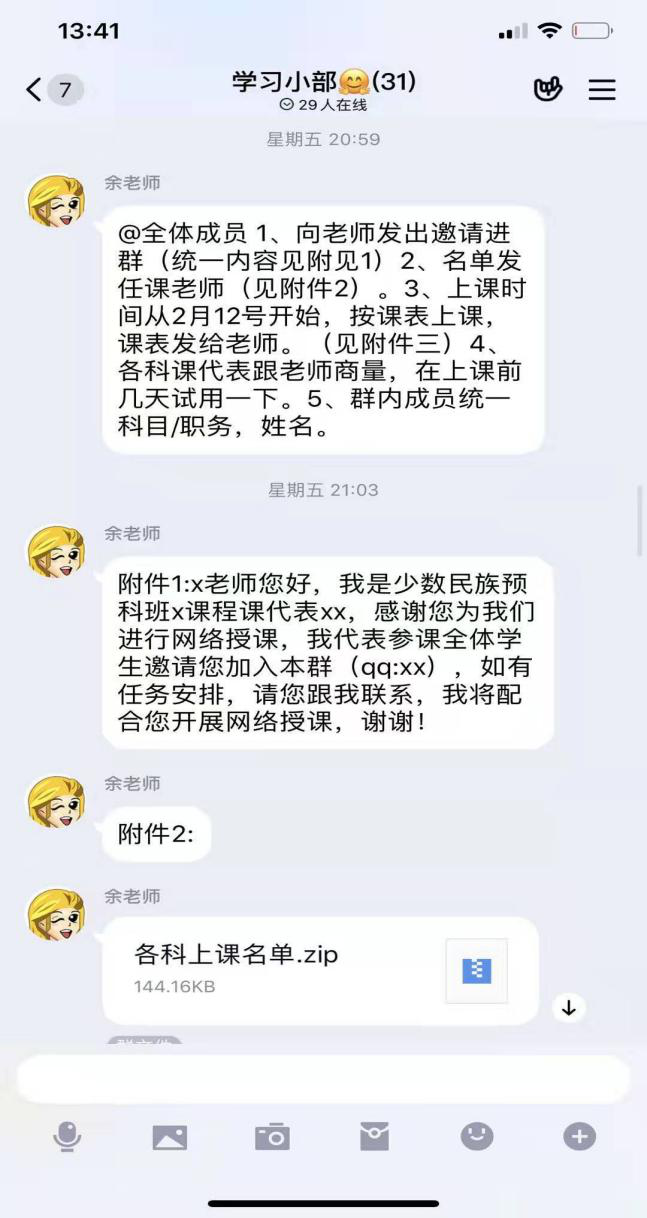 少数民族预科学生没有开通学校的云平台使用权限,他们来自全国各地,很多学生家在偏远地区,不乏一些同学存在硬件条件不足或对软件使用不太熟悉的情况。在考虑到这些实际情况后,根据学校“一院一策、一课一案”的线上教学思路,我院提前部署,从落实课程的教学管理服务,到协调课程安排及教学方式;从协调联系教师和学生、组建QQ课程群,到日常组织打卡签到,学院、预科管理办公室、年级团学组织协同联动,各司其职,紧锣密鼓的筹备,全力为“网”上教与学提供支撑与保障。