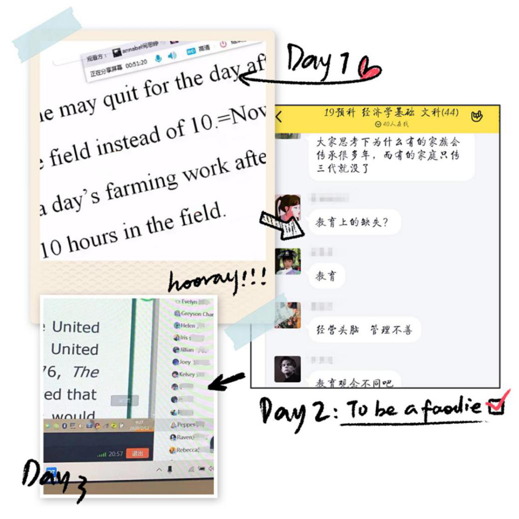 在线授课时不时遇到卡住、重声、掉线等问题,让我在课前预习上花的时间更多了,但每当这时我总是能想起西南联大学生在漏雨的棚里上课的样子,也让我想到此时正奋斗在一线筋疲力竭的医护人员,我们都面对着困难,但求识、求真、求学的心却不会被任何困难打倒。——威涵