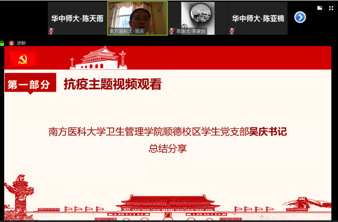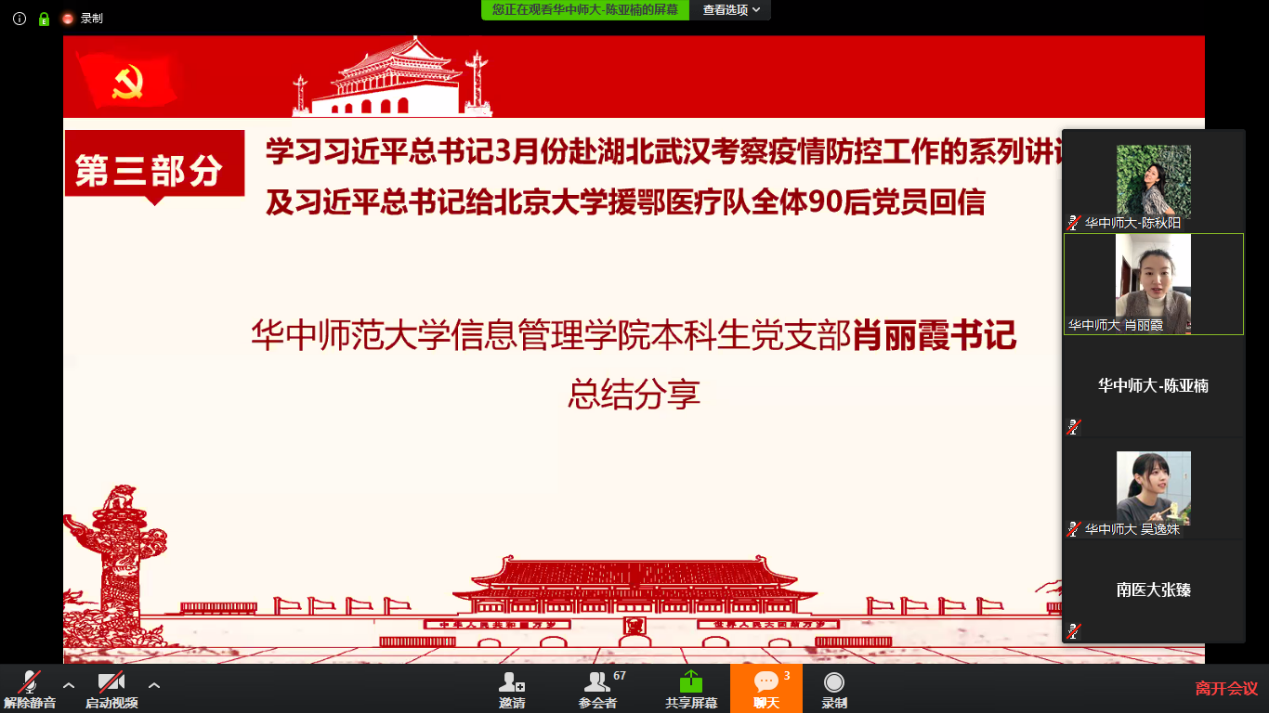 华大在线讯(通讯员 陈天雨 陈秋阳)3月25日,中共华中师范大学信息管理学院本科生党支部三月联合线上主题党日活动顺利开展。本次党日活动与南方医科大学卫生管理学院顺德校区学生党支部和校本部第二学生党支部联合开展。南方医科大学卫生管理学院顺德校区学生党支部书记吴庆、校本部第二党支部书记王益涛和我校信息管理学院本科生党支部书记肖丽霞共同策划并参加此次活动,活动由双方党支部党员陈亚楠同志和李紫剑同志主持。
