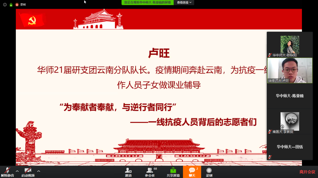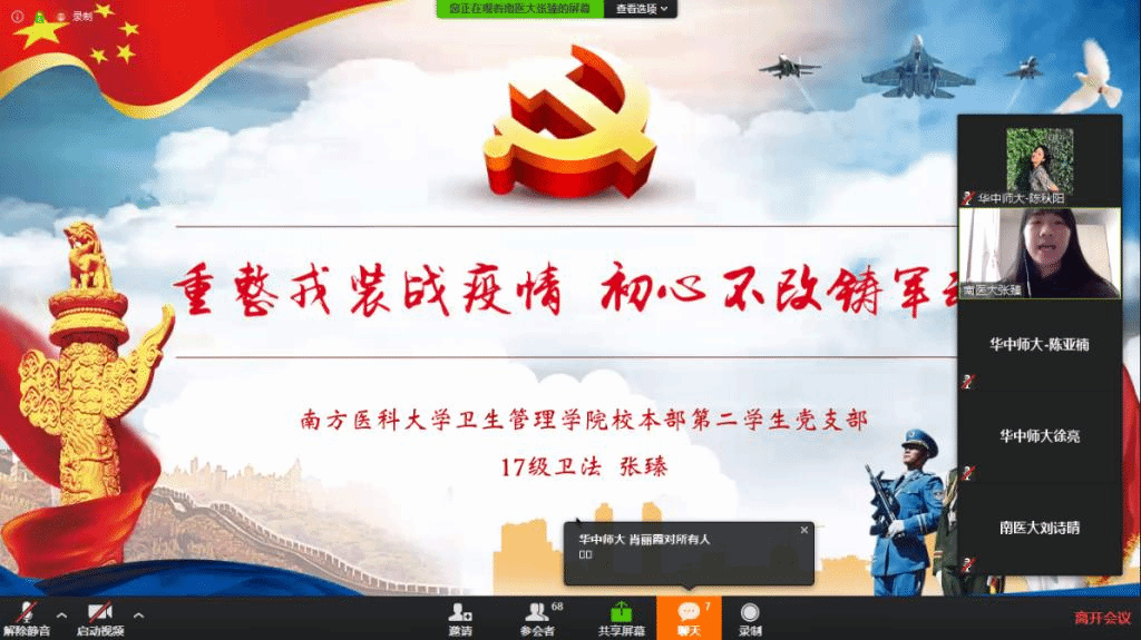 双方党支部党员同志从不同视角分享了所闻所见或亲身经历的抗“疫”故事。南方医科大学目前身在葡萄牙的交换生刘诗晴同志从国外留学生视角分享她了解到的国内外不同抗“疫”情况;社区志愿者李紫剑同志分享了他在社区的抗“疫”服务工作;退伍大学生张臻从朋友圈和战友角度分享了人民子弟兵参与一线抗“疫”的故事。我校处在疫情最严峻的地区,我校1349名医务人员子女线上辅导志愿者代表田恬同志,讲述了两个月以来线上一对一学业辅导工作和疫情期间医务人员家庭聚散离合的故事;我校第21届研支团云南分队队长卢旺同志,在疫情期间奔赴云南,投入西部基础教育建设,积极开展线上教学及心理辅导工作,用实际行动与国家站在同一战线;我院2016级学生,目前担任我校国际交流学院兼职辅导员的徐亮同志,也从国际留学生管理视角分享了我校来自100多个国家1037名留学生的疫情防控工作。通过支部党员同志生动具体的讲述,与会同志在对他们的抗“疫”行为表示高度赞扬,也纷纷表示在这场战疫中,新时代的青年人始终传承奋斗精神,勇挑重担,挺身而出,为打赢疫情防控阻击战贡献青春力量。