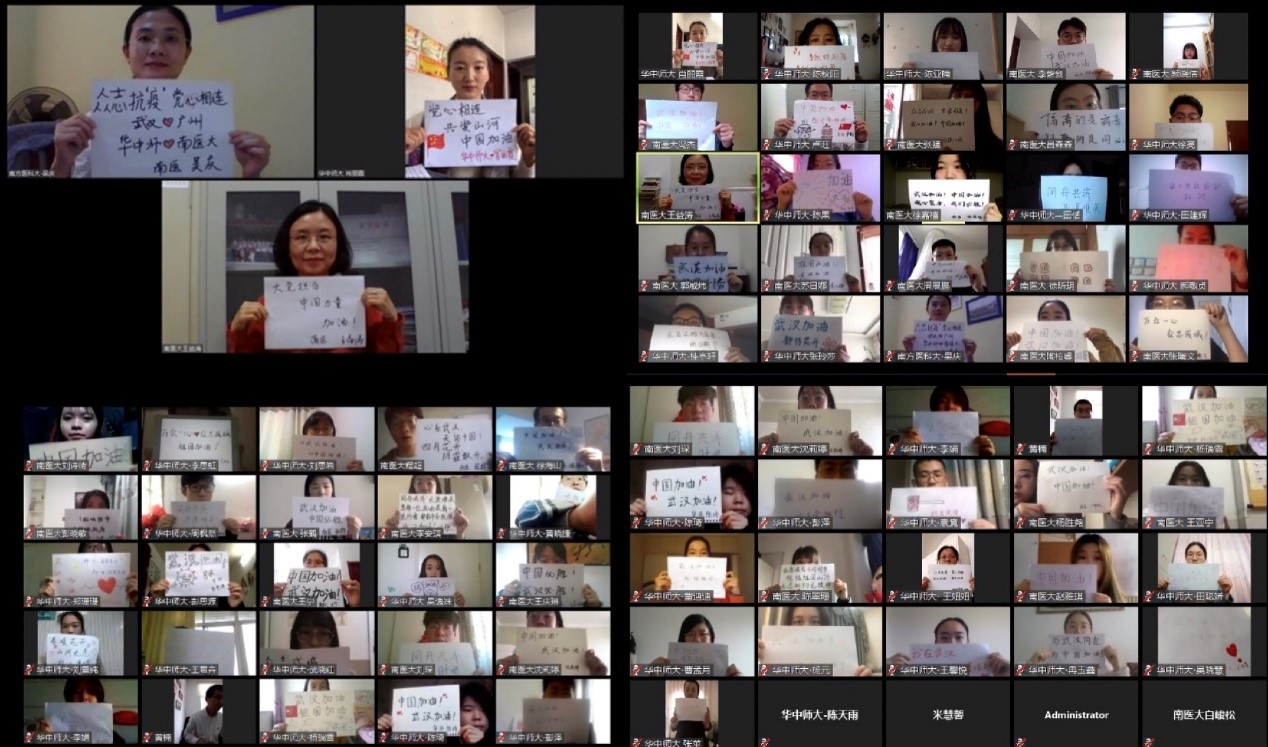 同气连枝,众志成城,活动最后,全体与会党员通过展示祝福语的方式表达了对祖国的深切祝福,本次线上联合党日活动取得圆满成功。希望党员同志们谨记“祖国如有难,汝应作前锋”的嘱托,期待疫情散去,能相约桂子山,同游珠江水畔。