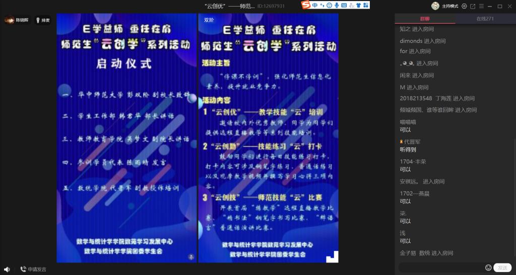 据悉,疫情期间,为了助力师范生“停课不停训”,强化师范生对在线教学特点与模式的认识,提升在线教学技能,数统学院面向全院师范生推出了由“云创优”——教学技能“云”培训、“云创勤”——技能练习“云”打卡、“云创技”——师范技能“云”比赛三个项目组成的“云创学”系列活动。该活动一经推出,便得到了全院近500人次师范生的踊跃参与,学院希望通过系列的培训、练习和比赛,能够实现疫情防控期师范生专业水平、教学技能和自学能力的全面提升。