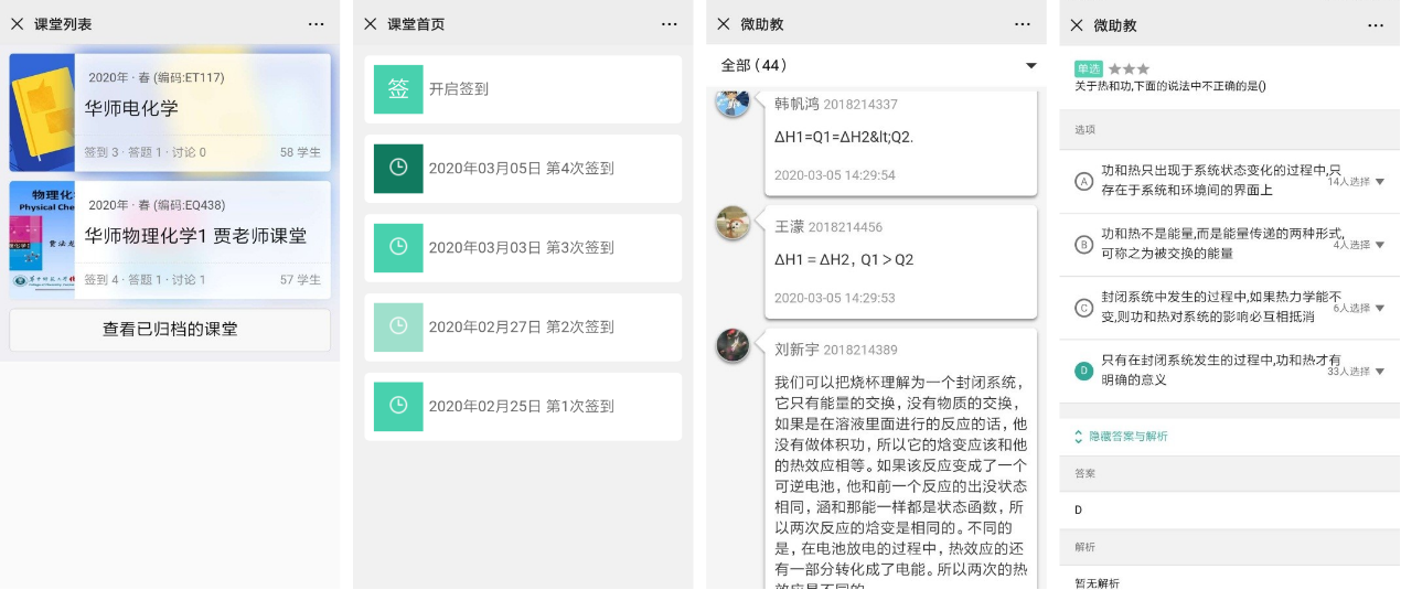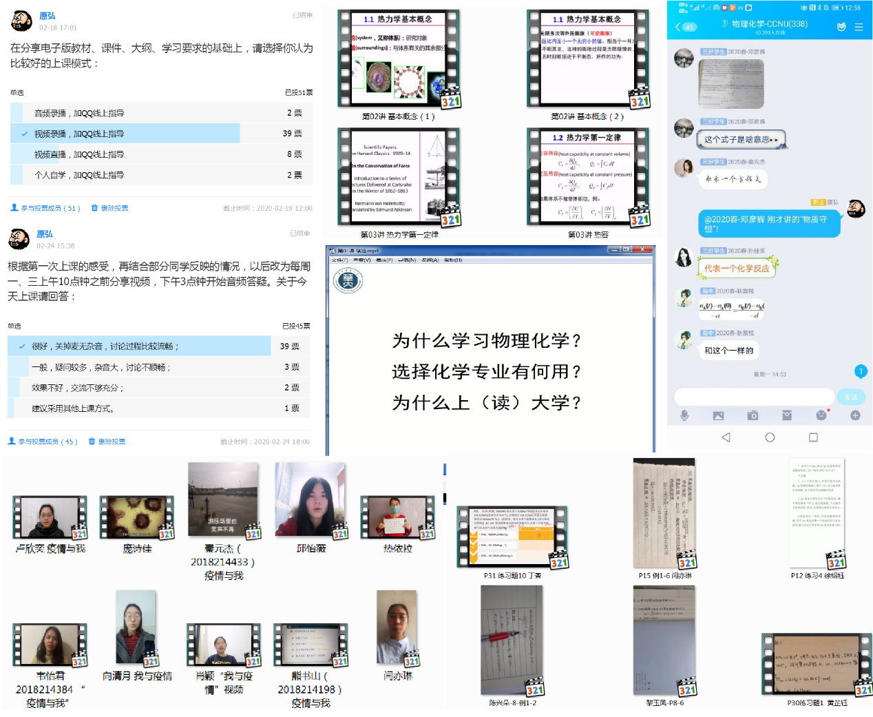 突如其来的新冠肺炎疫情,导致全国各地院校延迟春季开学返校时间,为了切实做好联防联控的工作,落实“停课不停教、停课不停学”要求,减少疫情对学生学业的影响,化学学院领导高度重视,结合本院实际,精准施策,全院师生积极配合,及时调整教学策略。《物理化学》课程组按照原定教学安排,于2月24日开始网上教学与指导,整体平稳。今天,让我们来关注《物理化学》课程组如何因地制宜实现线上教学效果最大化。