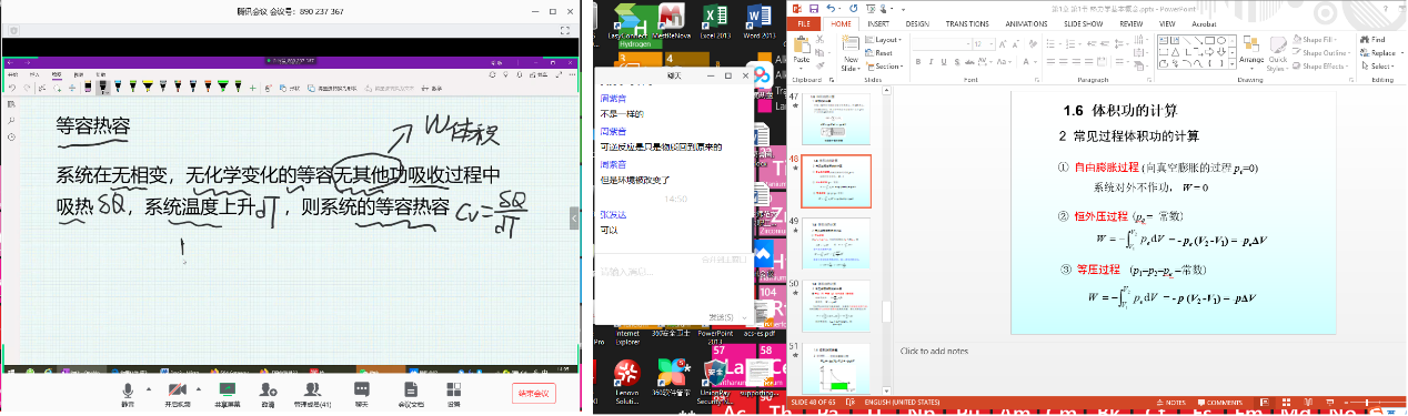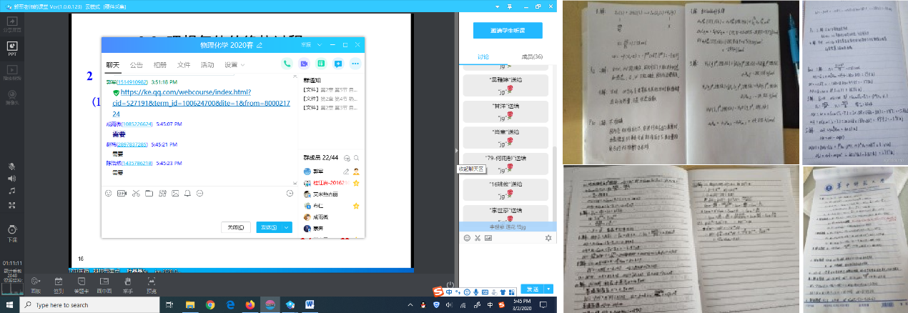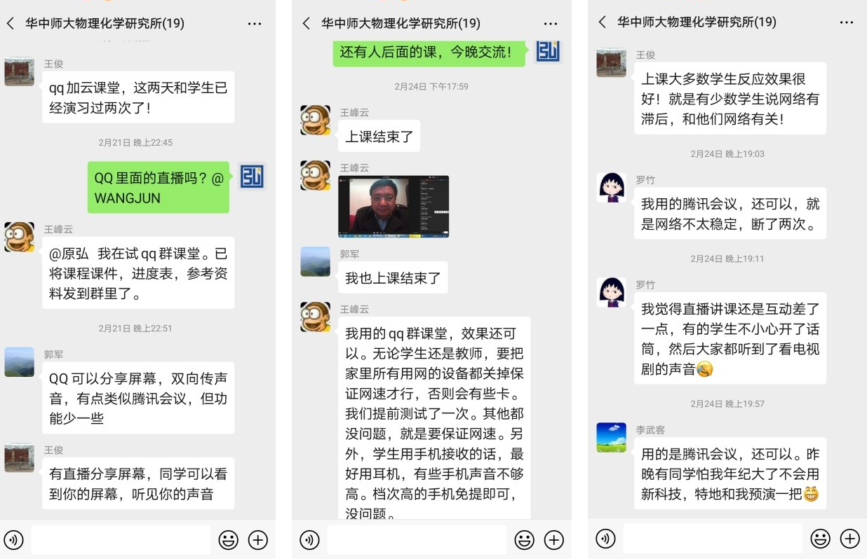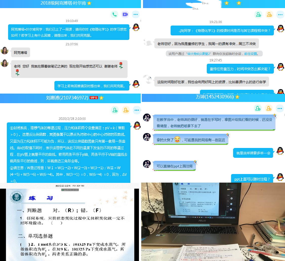 第三周开始,《物理化学》课程组的老师们正式开展线上授课。鉴于其他课程老师大都具备线上教学的经验,课程组授课教师在向同事、朋友“取经”后,根据现有设备条件和学生的实际情况,选择了适合自己的教学方式,并在课程组微信群内随时交流教学经验和体会。此外,课程组教师们还加入“物理化学教学之家”微信群,和全国同行交流教学心得,借鉴其他高校先进经验,相互学习,共同进步。