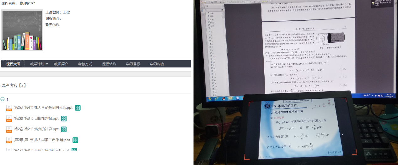 由于上学期没有发放《物理化学》教材,为解决学生居家学习没有教材的问题,课程组老师特别安排一名高年级学生(携带教材回家复习准备考研)拍照制成电子版,再分享给各位师生,同时老师们也把手头上的其他参考书分享给同学们,保证同学们在家也能享有足够的教学资源。