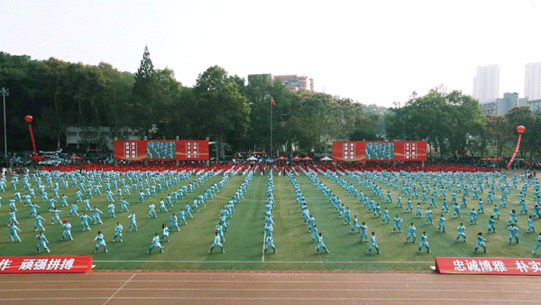 随后,运动员代表林俊泓、裁判代表李运进行了宣誓。赵凌云宣布运动会开幕。接着,文体表演拉开帷幕:教职工组成的太极扇方队展示出中国传统文化的魅力;健美操方阵汇集各院系数千名学生,动作整齐划一;武术和刀术表演、覆盖半个绿茵场的五星红旗都为观众带来了丰富的视觉享受。