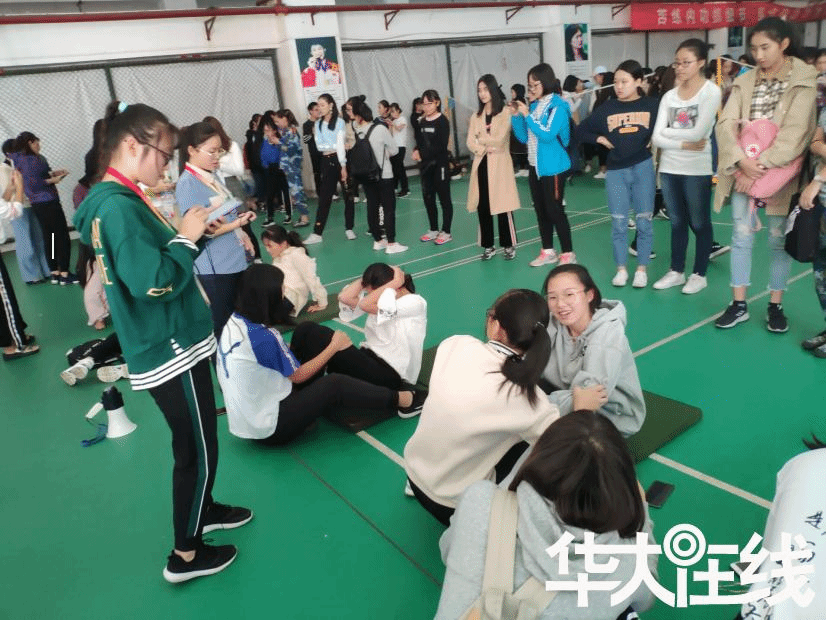本次比赛为团体赛,只有选手达到20名的队伍才能参加比赛,许多学院因无法凑齐人数而弃权。22支队伍依此上场,分为两人一组,一人进行仰卧起坐,一人压腿,一分钟后交换位置。裁判边做示范边指出,双手要抱住头部,上身完全起来才算一个标准的动作,并且指出了比赛的技巧,双腿弯曲呈九十度不费力气。每一组都有裁判计数并进行严格监督,当出现选手动作不规范的情况时,裁判会指出问题并暂停计数。