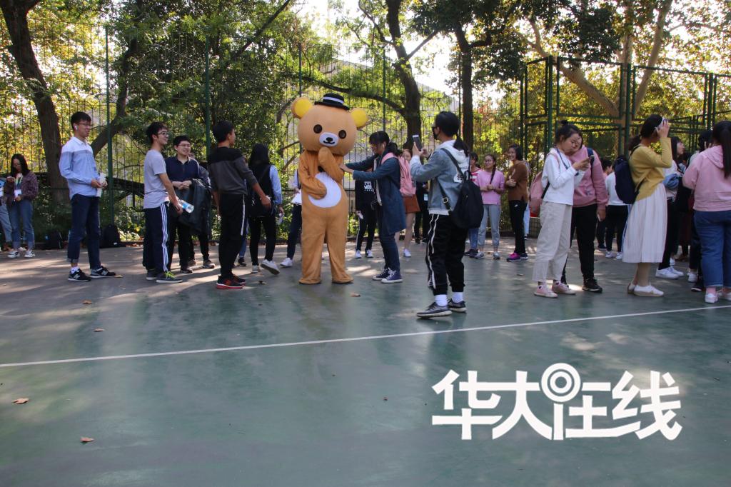 比赛开始,数学与统计学学院的观众带来一名特殊的“后援团”成员——“吉祥物”轻松熊,并拉横幅给选手加油助威,引来了不少人的围观。