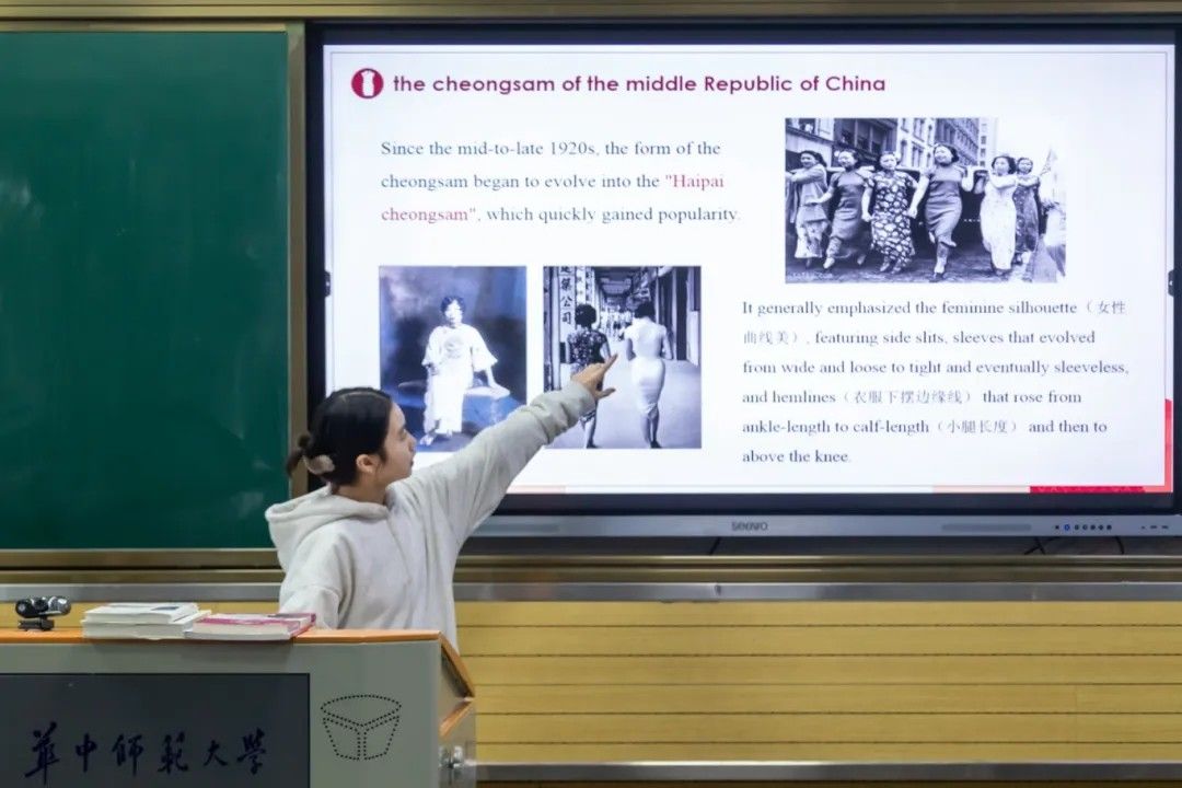 在《中国文化概论》课堂上,主讲教师、外国语学院副教授杨畅接连向同学们提出了这些问题。作为《大学英语》高阶课程,《中国文化概论》主要授课对象是大学英语发展级或提高级学生,教学内容包括哲学、宗教、文学、艺术、教育、科技、体育、节日、饮食、服饰、建筑10个专题。