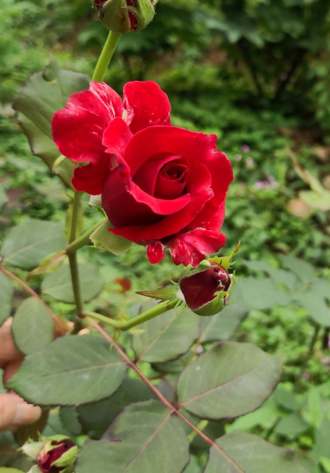 来到山西坡下,往上一看,大片的绝色牡丹己都凋谢枯萎,零落殆尽。由于花期己过,又受到连日的风吹雨打,昔日雍容华贵的风采早已不再,全成了这失魂落魄的模样。正在我感到不快之时,不远处的那片红让我眼前一亮。定睛看去,不错,这正是月季。山坡下小路旁挺立着的许多月季花,正在竞相绽放。如此美艳的花景,立刻让我兴奋了起来。